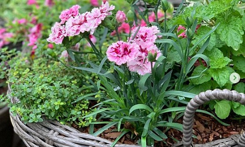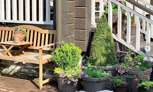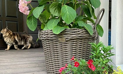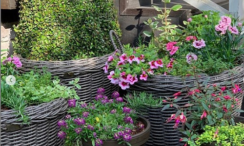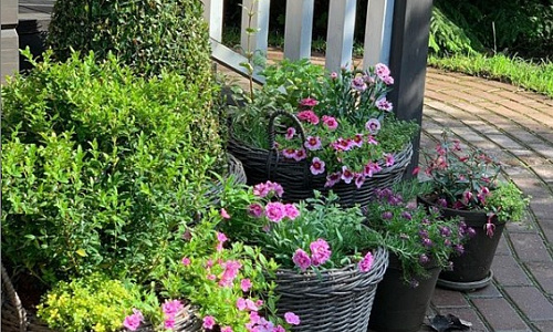 Плетеные кашпо с ручками в частном саду в Подмосковье.