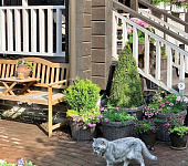 Шикарный сад в Подмосковье украшенный великолепными цветочными уличными горшками цвета мокко.
