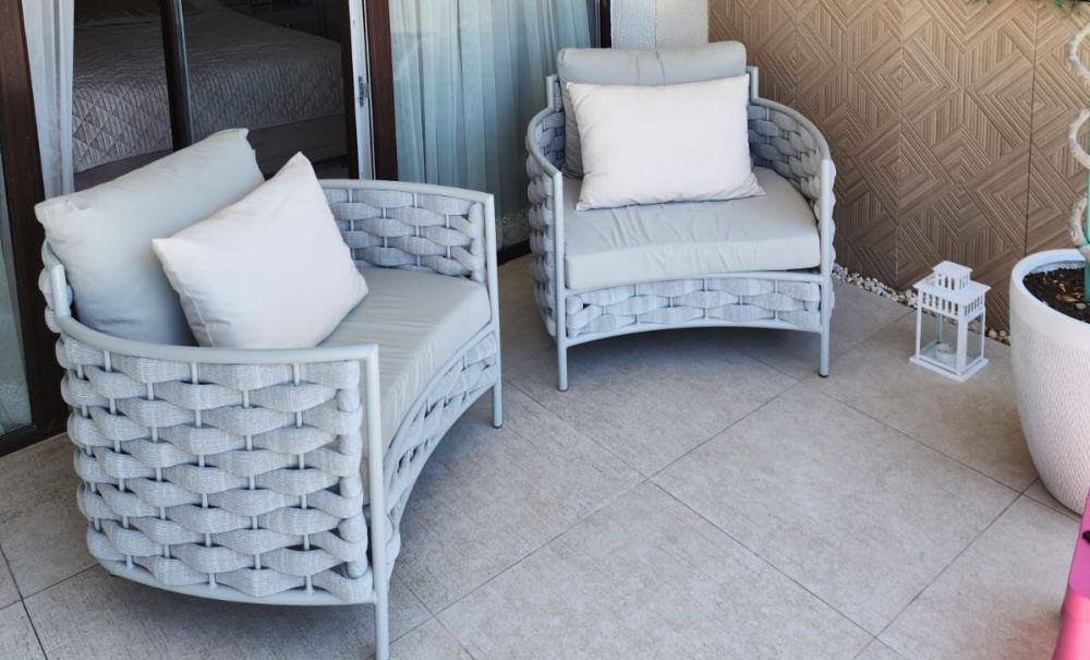 Кресла выполнены на алюминиевом каркасе с ручным плетением из мебельного роупа. Такое решение позволяет использовать мебель круглый год на открытом воздухе: материал не боится влаги, солнца и перепадов температуры, при этом остаётся мягким и комфортным на ощупь.