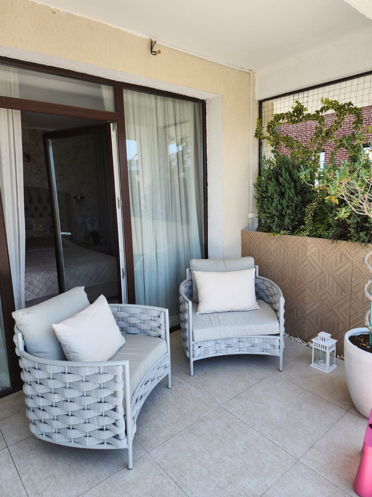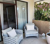 Особое внимание уделялось пропорциям и плотности плетения — кресла выглядят аккуратно и архитектурно, поддерживают современную эстетику террасы и хорошо сочетаются с светлой плиткой, стеклом и озеленением. Компактный формат позволил организовать приватную зону для утреннего кофе и вечернего отдыха без перегрузки пространства.