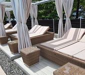 В 2018 году мы изготовили и смонтировали 6 беседок из алюминия с подиумом из террасной доски для открытого бассейна отеля Пульман в Сочи. В каждую беседку поставили двойной шезлонг из искусственного ротанга круглого плетения и два столика.