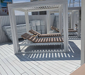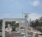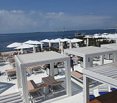 На Приморском пляже в городе Сочи установлены плетеные лежаки и столики нашего производства.