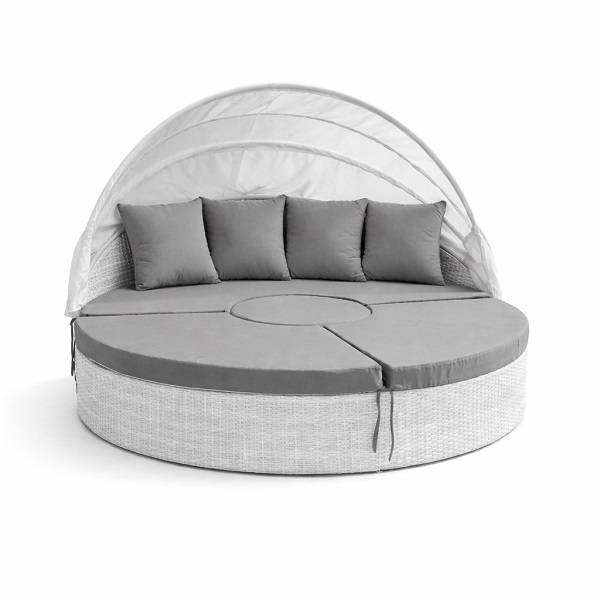 Пляжная кровать Море серого цвета оборудована тентом, подушками сидений и подушками под спинку из уличной ткани. Цвета на выбор во большом ассортименте. Алюминиевый каркас и плетеное волокно цвета бело-серый.