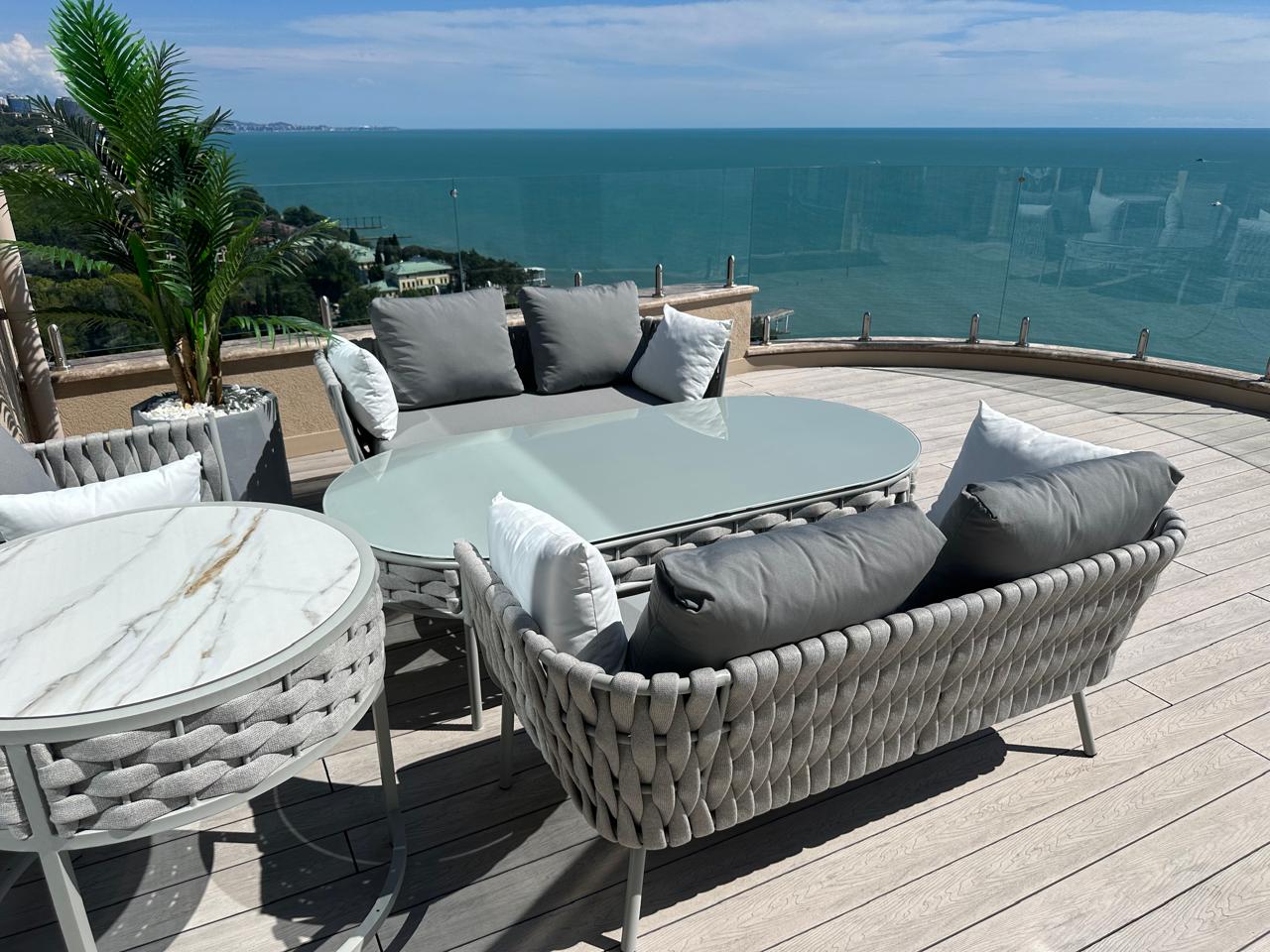 Оплетка фактурная, не выгорает на солнце, не впитывает воду, не трескается на улице, выполнена из инновационного материала, разработанного специально для плетения уличной мебели.