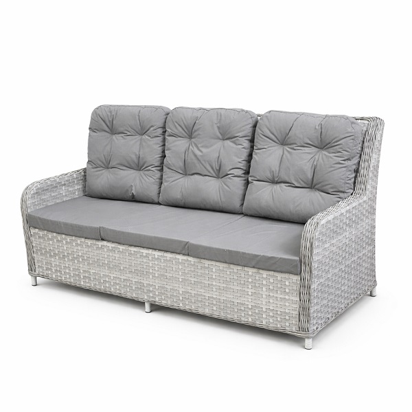 Глубокая посадка и объёмные подушки обеспечивают удобство даже при длительном отдыхе. Материал не выгорает на солнце и легко очищается, что делает диван практичным в эксплуатации.