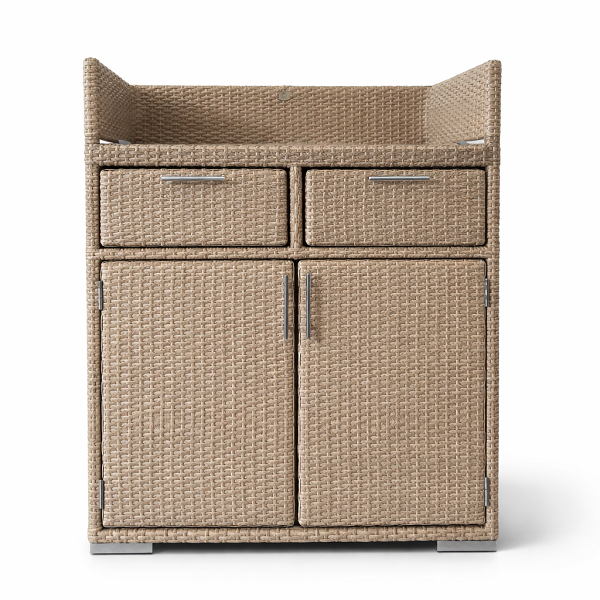 Два выдвижных ящика для столовых приборов, две полки скрытые за распашными дверями комода позволят упорядочить хранение всего необходимого для обедов и ужинов на открытом воздухе.