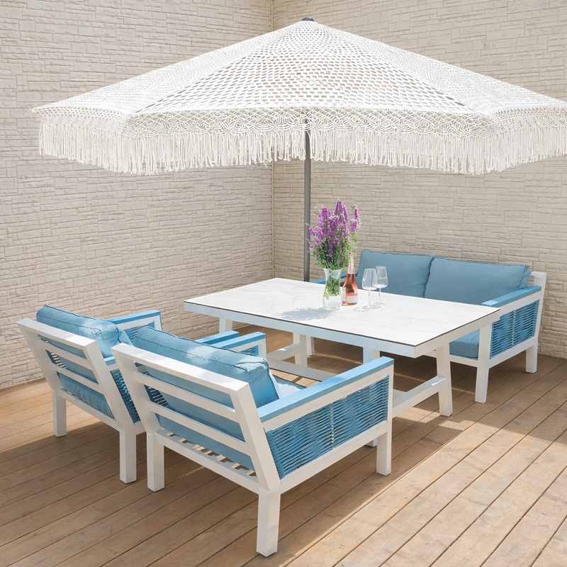ОписаниеКомплект уличной мебели с зонтом макраме — это воплощение курортной эстетики, созданное для пространств, где ценят красоту, качество и длительный комфорт.