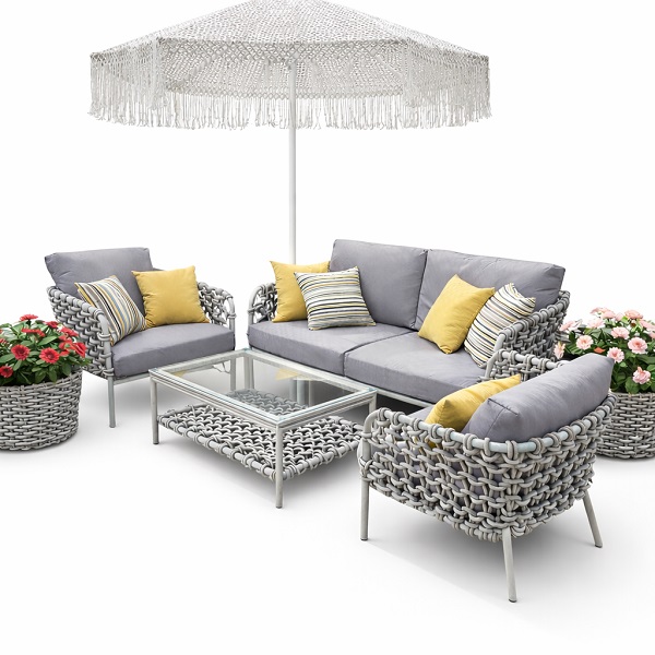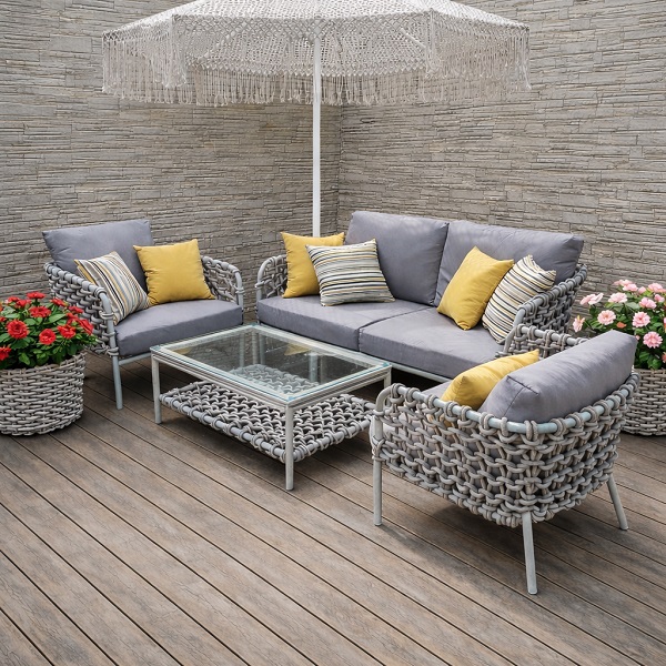 Эта мебель выглядит необычно, дорого и по-настоящему архитектурно. Объёмное канатное плетение создаёт выразительный силуэт, добавляет фактуры пространству и превращает обычную террасу в зону уровня resort.