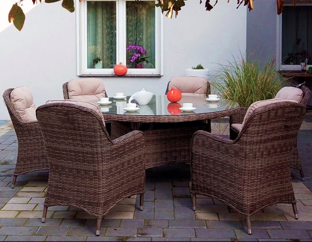 Ротанговая мебель с круглым столом украсит любую элегантную террасу. В составе комплекта: круглый стола диаметром 160 см и 6 кресел из искусственного ротанга с анатомической спинкой.