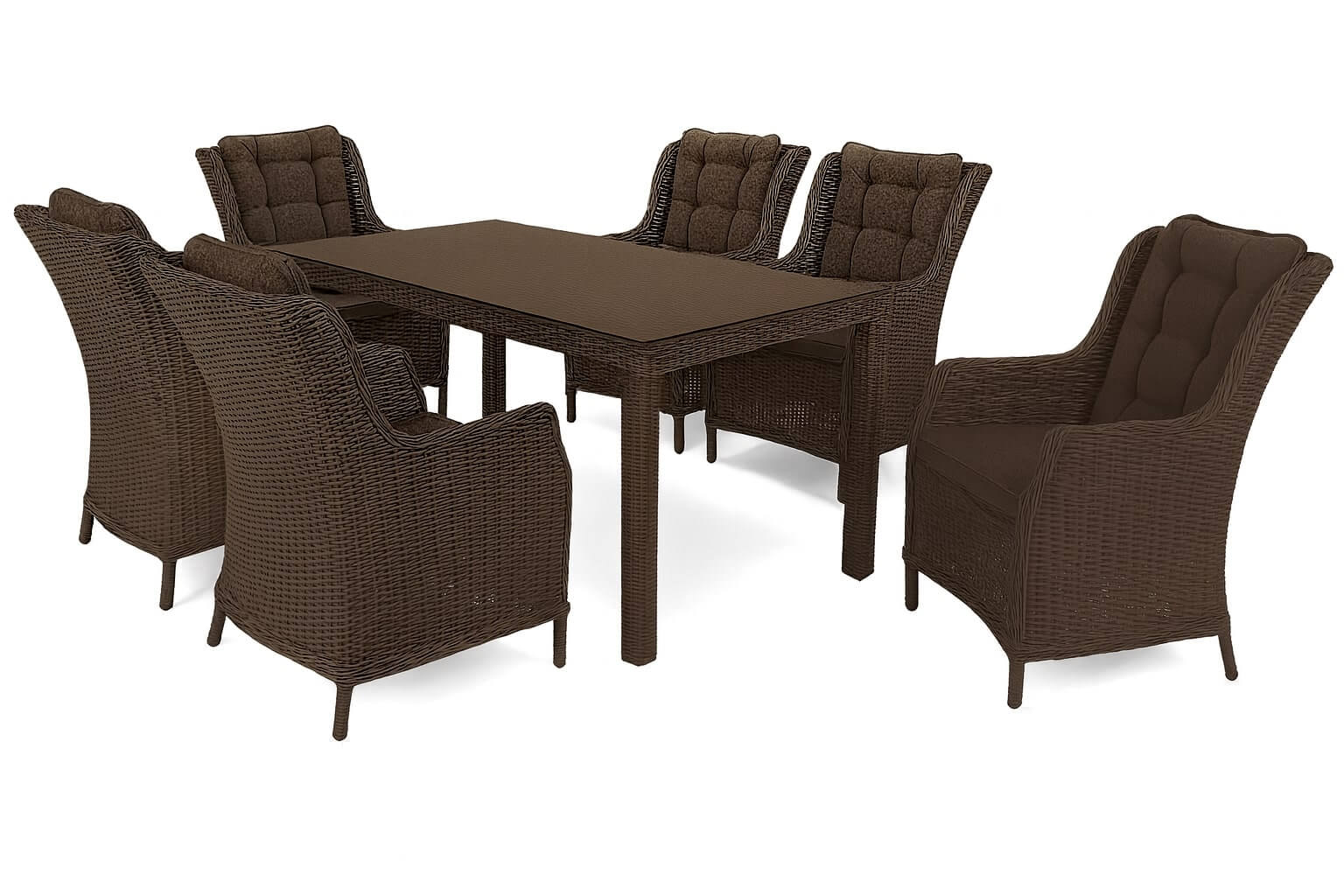 Обеденный комплект из искусственного ротанга высочайшего качества, отвечающий ожиданиям самых требовательных пользователей. Обеденный набор из элегантного техноротанга ручной работы, устойчивого к погодным условиям и УФ-излучению. Стол имеет длину 180 см и столешницу из закаленного стекла толщиной 5 мм. Каркас мебели выполнен из алюминия, устойчивого к погодным условиям. Кресла очень удобные: с глубоким сиденьем и высокой фигурной спинкой в поясничной части.