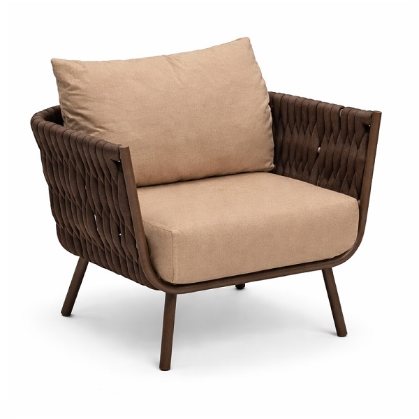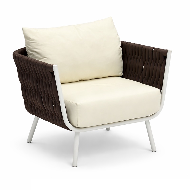 • современных интерьеровУличное кресло Корд плетеное шнуром- роупом коричневого цвета. Каркас алюминиевый, окрашеный порошковой краской.