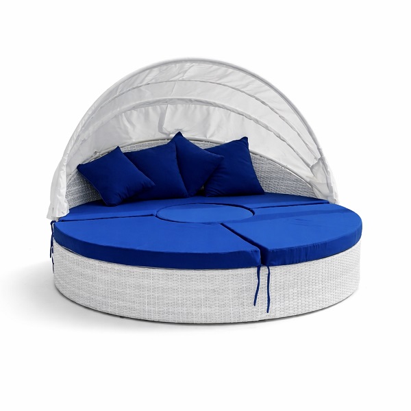 Круглая кровать для улицы из искусственного ротанга состоит из 4-х элементов - полукруглого плетеного дивана со складным тентом для защиты от солнца, одного центрального круглого пуфа, и двух пуфов в форме четверти круга.
