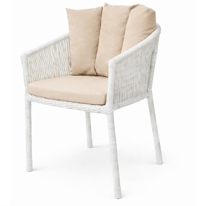 Купить кресло из искусственного ротанга белого цвета с бежевыми подушками — оптимальное решение для террасы, веранды, сада, кафе, ресторана и отеля. Уличное кресло выполнено на прочном алюминиевом каркасе и оплетено качественным синтетическим ротангом, устойчивым к влаге, ультрафиолету, перепадам температур и интенсивной эксплуатации.